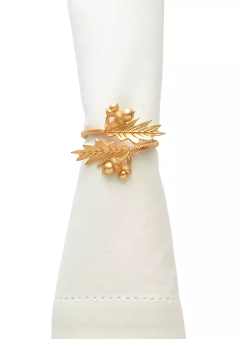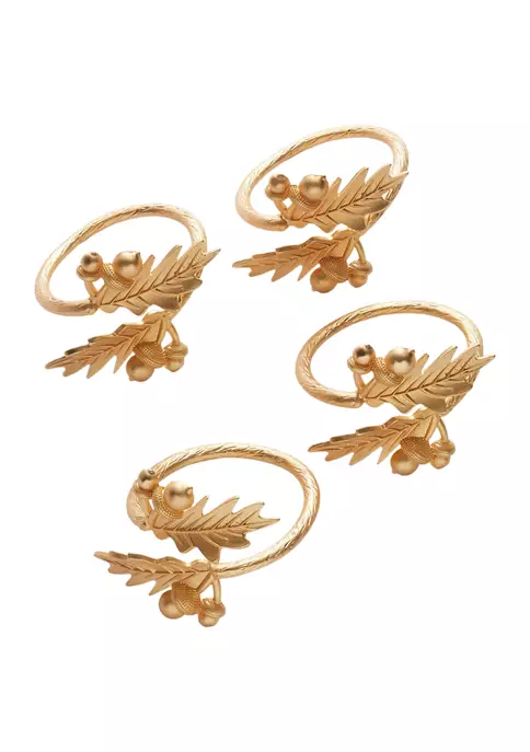 Gold-tone metal shaped into leaves with acorns makes this set of 4 napkin rings from C&F a festive pick for finishing your table dΓ©cor.