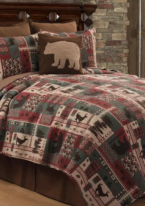 Relax in a woodsy cabin with the Killian Ridge Quilt Set after a day of exploring the great outdoors. In a rustic colorway comprised of brown, green, red, and beige, a mosaic of wildlife and plaid patterns, makes this quilt a must-have for any outdoors enthusiast. Reverse to a beige striped pattern for additional styling options. Crafted of cotton, this bedding set is machine washable for easy care. Coordinating accent pillows, euro shams and bed skirt available separately.