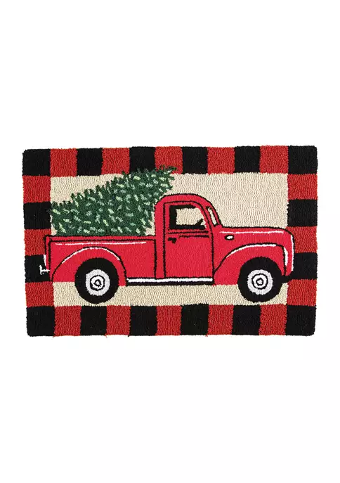 GREAT FEATURES: The Red Truck Plaid hand guided machine hooked rug features an iconic red truck and Christmas tree design with a checked border