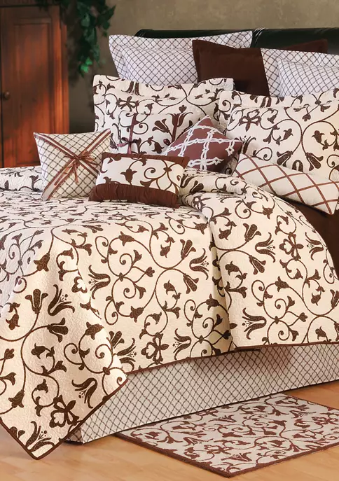 Give your bedding a refresh with the Seraphina Brown Quilt Set. A brown-on- soft white vine pattern lends a simplistic, yet pretty aesthetic while a lattice reverse opens up a world of additional styling options. Finished with a vermicelli stitching pattern and a fabric edge, the Seraphina Brown quilt set is crafted of 100-percent cotton and is machine washable for easy care. Coordinating accent pillows, euro shams, and bed skirt available separately.