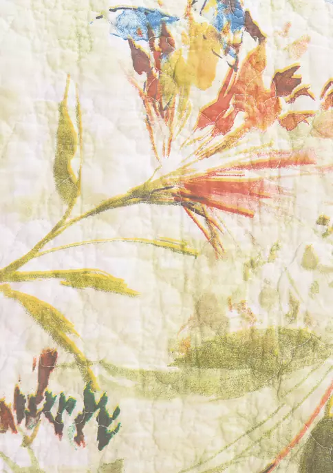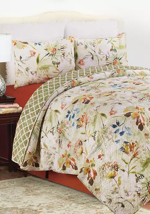 Transform your bedroom into a work of art with the Watercolor Floral quilt collection. An artistic design of watercolor flowers drifts across a relaxing scene of variable spring garden green. This collection reverses to an elegant lattice pattern over a verdant watercolor ground. Watercolor Floral pairs beautifully with our Paprika Matelasse and Trellis white euro shams. Crafted of cotton and machine washable for easy care. Accent pillows, euro shams, and bed skirt sold separately.